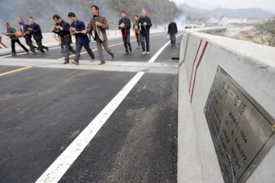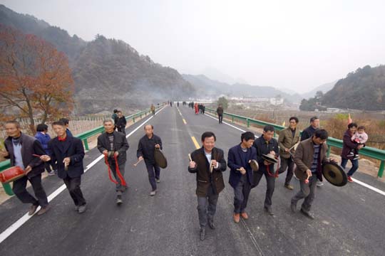 11月10日,大別山旅游扶貧快速通道水毀修復(fù)工程漁潭段改線建成通車。當?shù)卮迕袂描尨蚬?、載歌載舞,以自己特有的方式歡慶這一時刻的到來.