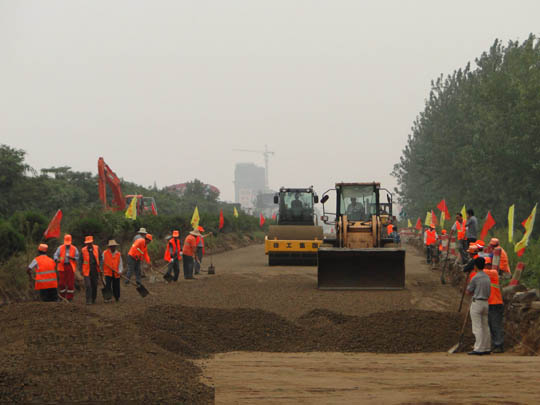 為迎接2012年11月10日在金太陽國(guó)際會(huì)展中心開幕的第三屆中國(guó)國(guó)際羽絨節(jié),六安市交通公路實(shí)業(yè)有限公司臨危受命承建G312六安段(金橋西至皖西大道)改建工程延伸段。該工程起于K565+330皖西大道大交叉口處,終點(diǎn)位于K567+200迎賓大道交叉口處,全長(zhǎng)1870米,老路為雙向四車道一級(jí)公路,路基寬24米,采用下挖反填法,碎石化路面。公司上下克服資金緊、工期短、施工難度大等困難,放棄假日休息,全力以赴,日夜奮戰(zhàn),確保按時(shí)、按質(zhì)、按量完成該工程。目前1.1公里換板修補(bǔ)和面層碎石化已結(jié)束,700米挖方段的級(jí)配碎石回填已完成,正在進(jìn)行水穩(wěn)攤鋪,預(yù)計(jì)10月25日完成主體工程。為六安的招商引資創(chuàng)造良好交通環(huán)境,為展示“五色、精彩”六安形象添彩。
